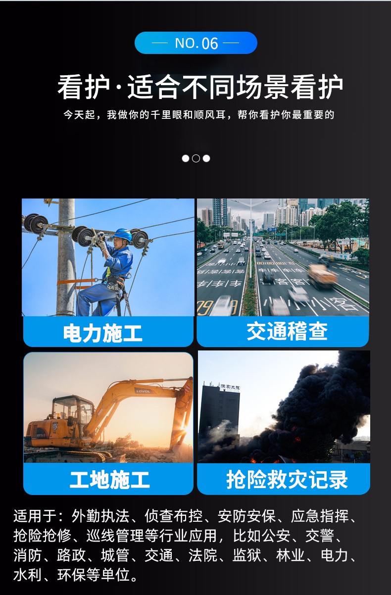 適用于外勤執(zhí)法、偵查布控、安防安保、應急指揮、搶險搶修、巡線管理等行業(yè)應用,比如公安、交警、消防、路政、城管、交通、法院、監(jiān)獄、林業(yè)、電力、水利、環(huán)保等單位。