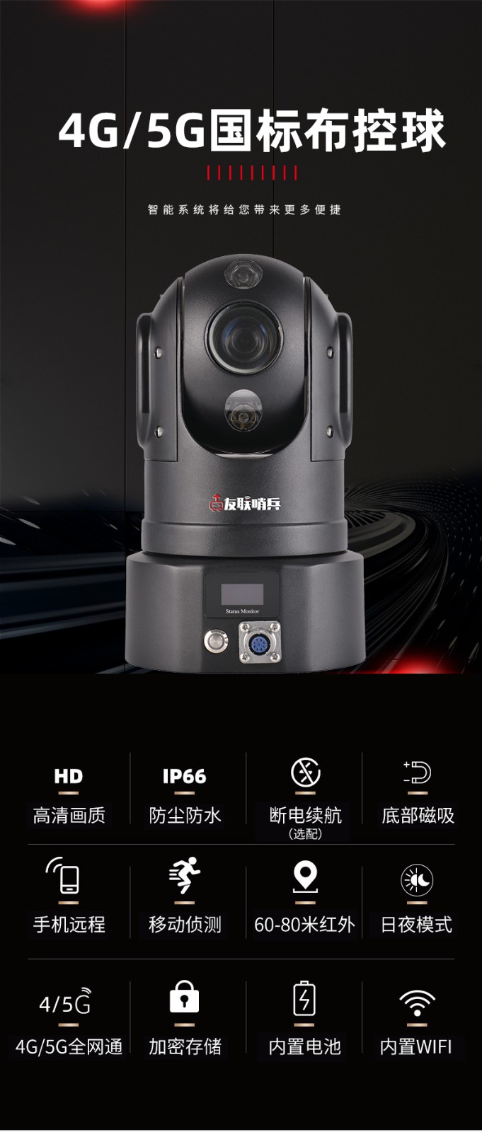 友聯(lián)哨兵無線高清國網(wǎng)電力雙4G智能AI布控球 黑光原彩 | 紅外夜視 友聯(lián)哨兵移動監(jiān)控布控球,主要用于視頻監(jiān)控、取證,采用蓄電池為主供電的模式,無線網(wǎng)絡傳輸,啟用流程簡單,擺脫繁瑣的選址操作 ;用戶提供高清、流暢、穩(wěn)定的視頻效果,可實現(xiàn)存儲、傳輸、定位、對講等功能,并支持人臉車牌識別、安全生產(chǎn)行為分析、目標檢測AI智能視頻算法,實現(xiàn)多智能化管控。整機投入使用,無需拆裝,縮短工期;一次性費用投入,多場景反復使用,獲得更大投入產(chǎn)出比;根據(jù)項目進度更改部署位置,使用更靈活;易于擴展新功能,兼容性更強。